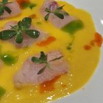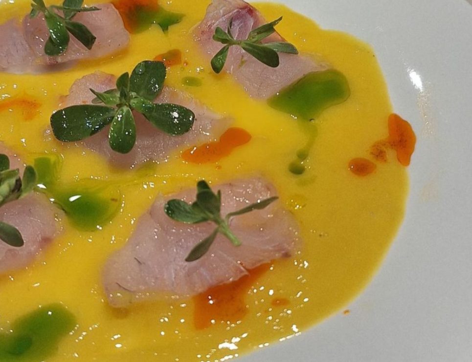 Róbalo con aguachile de mango, aceite de chistorra y verdolagas, foto de Miriam Carmo