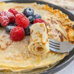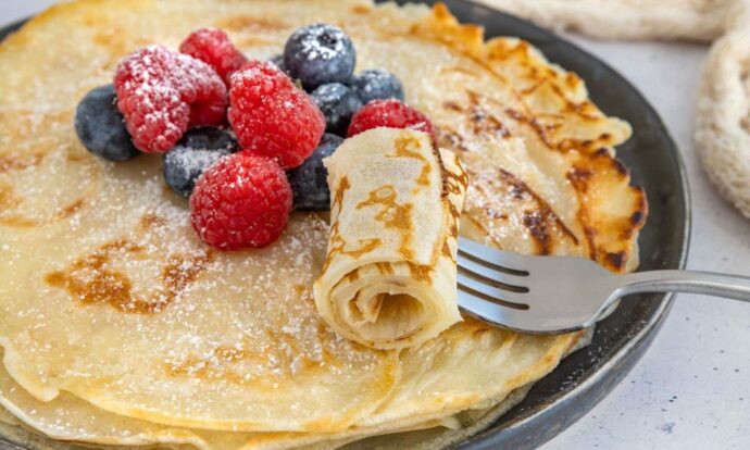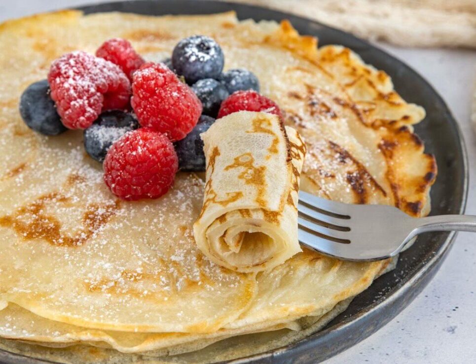 Crepas sin relleno, decoradas con frutos rojos y azúcar glass. Foto de Canva.