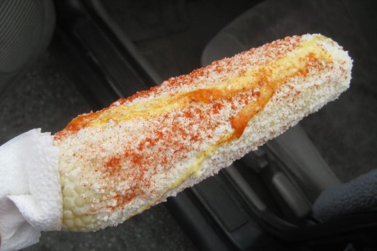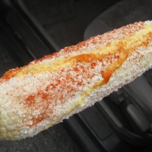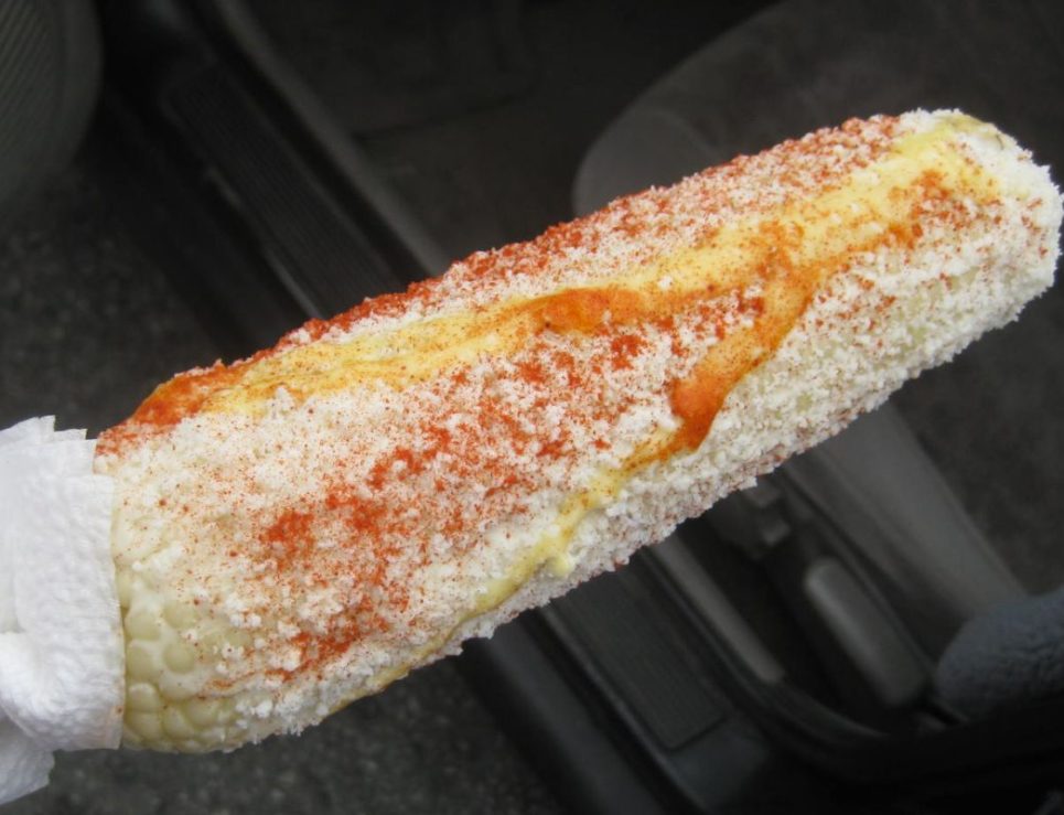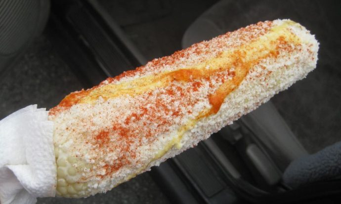 Elote preparado con mayonesa, queso fresco y chile en polvo. Foto de Flickr.