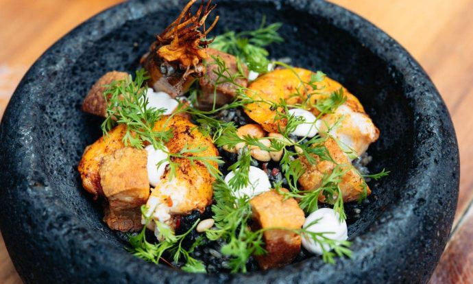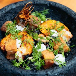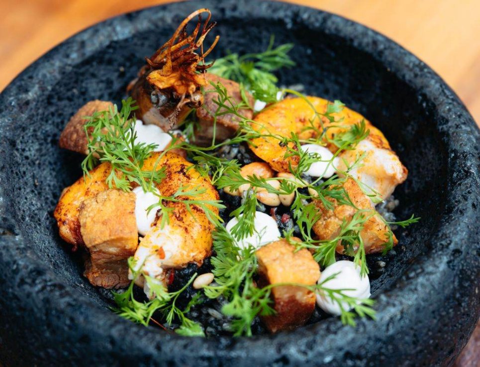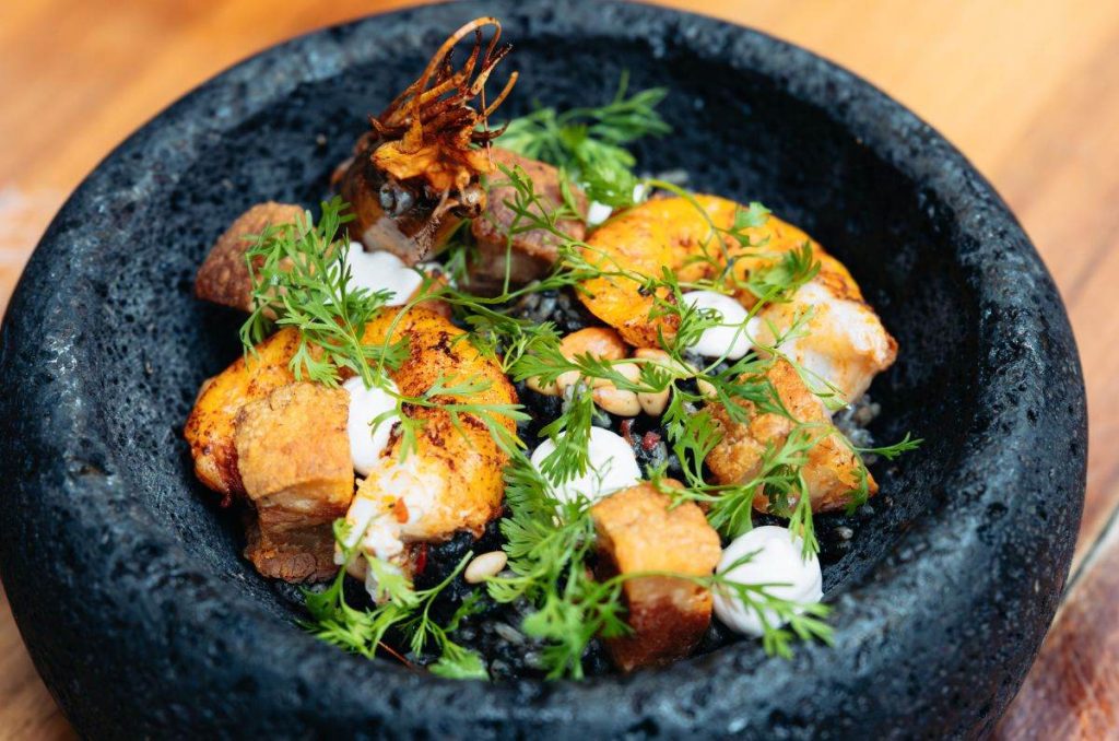 Arroz negro al carbón + camarón + castacán + labne + almendras fritas + hierbabuena del chef Roberto Solís, foto proporcionada por ARCA