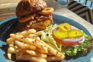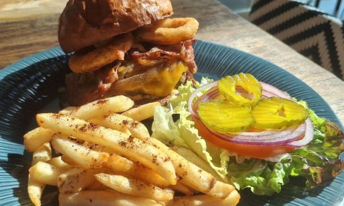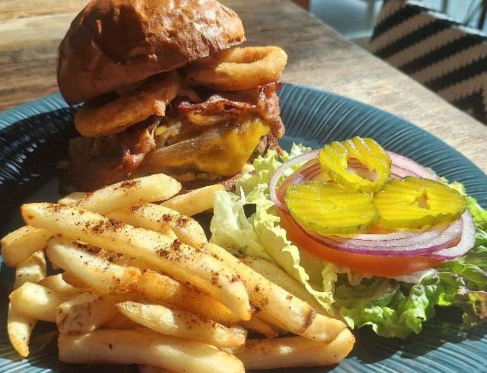 Koba Burger (pan de la casa, carne Angus, queso Cheddar, cebolla caramelizada, aros de cebolla, tocino, lechuga, tomate, pepinillos y mayonesa de chipotle); foto de Miriam Carmo