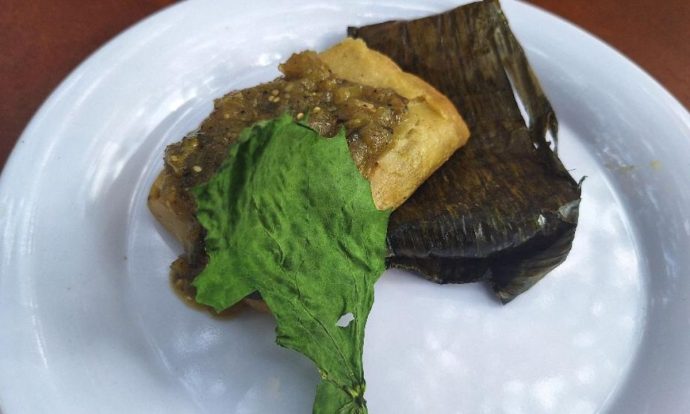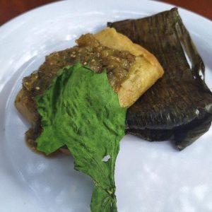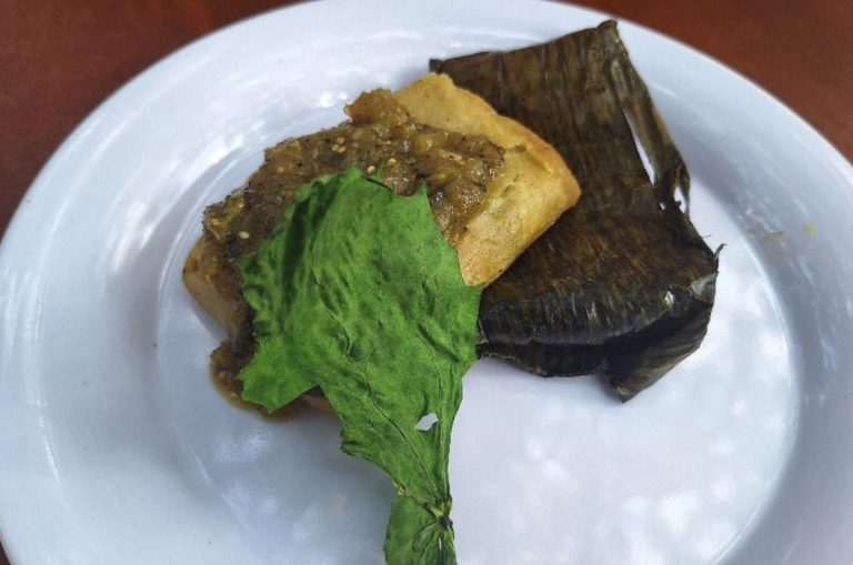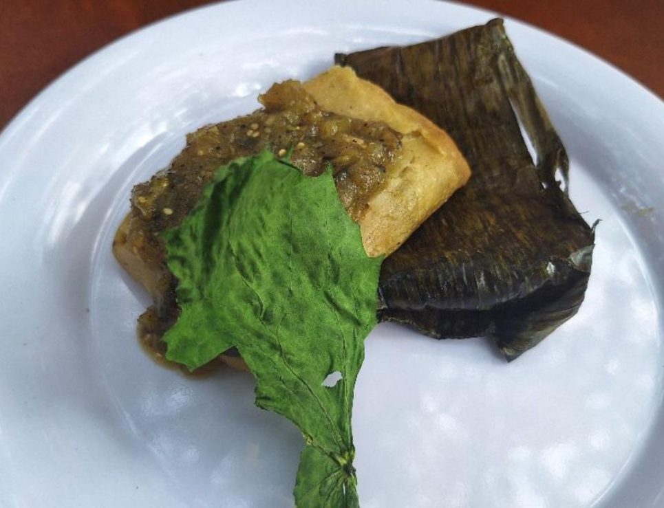 Tamal de calabaza en pib y salsa verde con verdolagas del chef corporativo Elio Xicum de Grupo Mesones, foto de Miriam Carmo