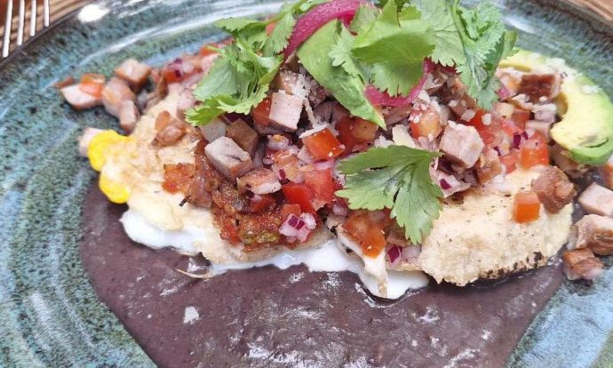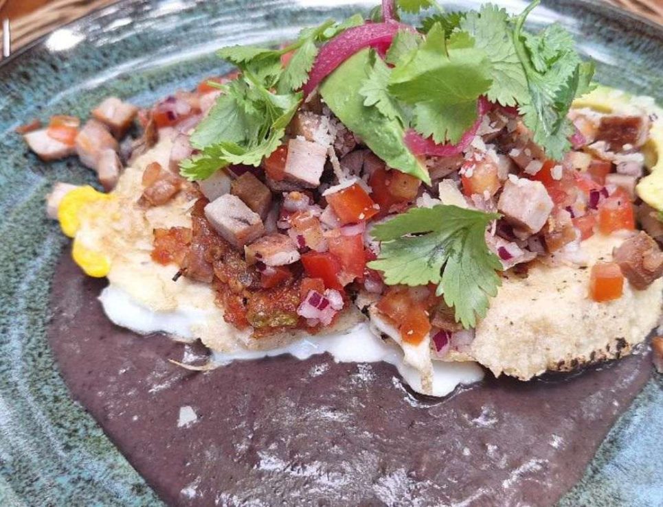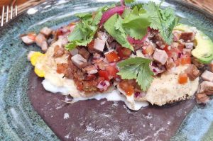 Desayuno: huevos encamisados con tortillas hechas a mano y cocidas al comal, salpicón de carne ahumada, tomate, cebolla, queso, crema, aguacate y salsa de chiltomate, foto de Miriam Carmo