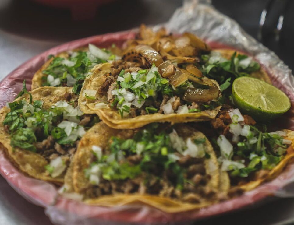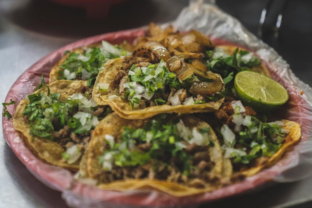 Orden de tacos servidos con cebollas asadas y cilantro. Foto de Pexels.