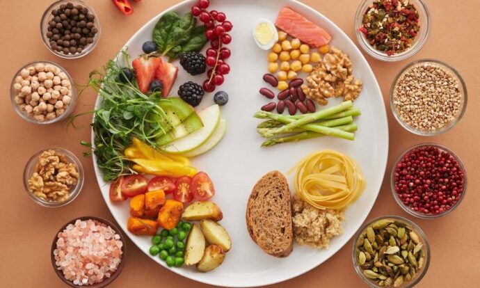 Plato con los tres grupos del plato del buen comer. Foto de Canva.