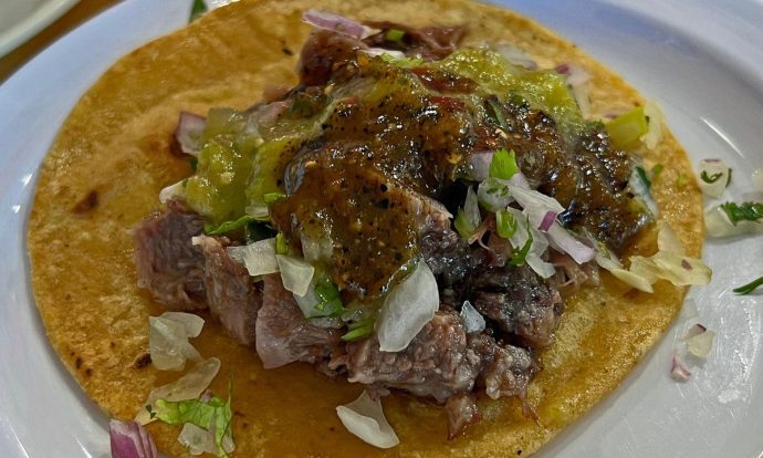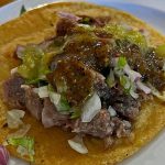 Taco con tortilla de maíz preparado con salsa roja y verde. Foto de Flickr.