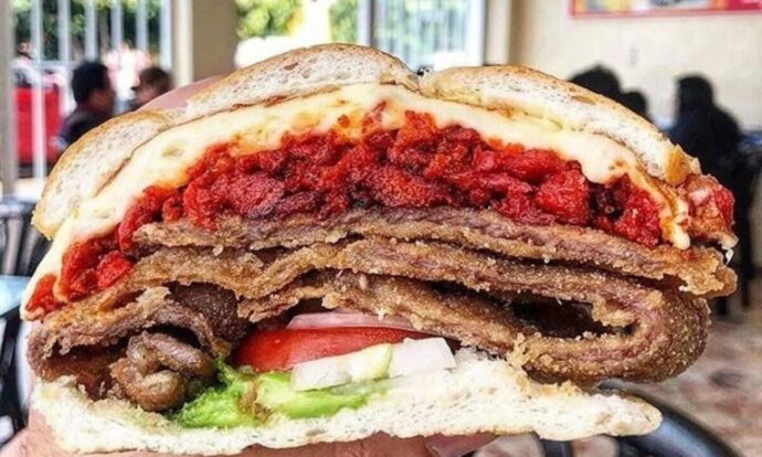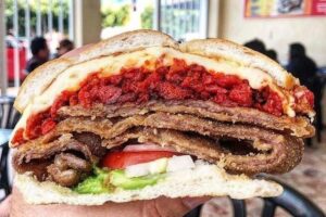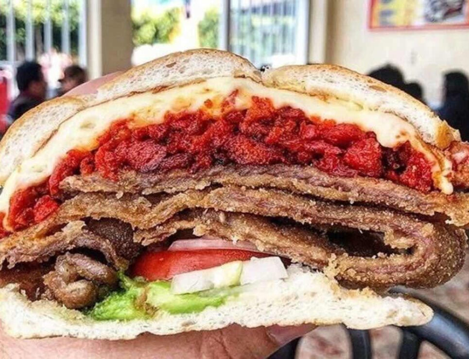 Torta de milanesa con chorizo frito, aguacate y jitomate. Foto de Instagram Aerotortas.