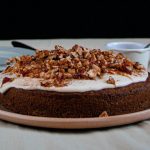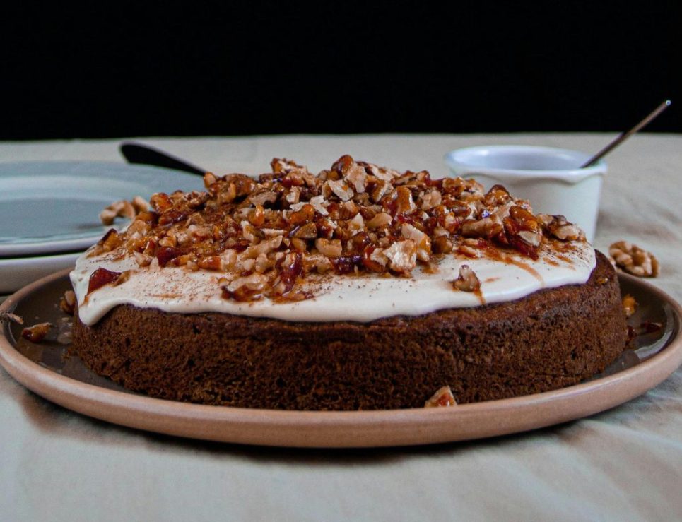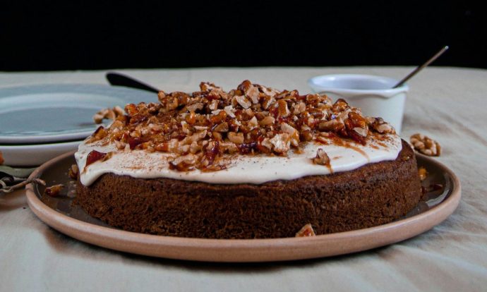 Pastel de zanahoria con betún de queso crema y nueces caramelizadas. Foto de Pexels.