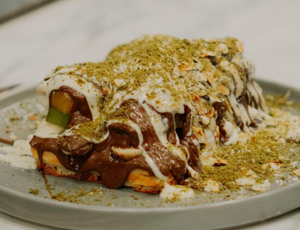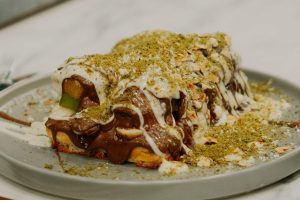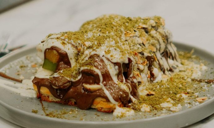 Waffle con crema de avellanas y pistaches molidos. Foto de Pexels.