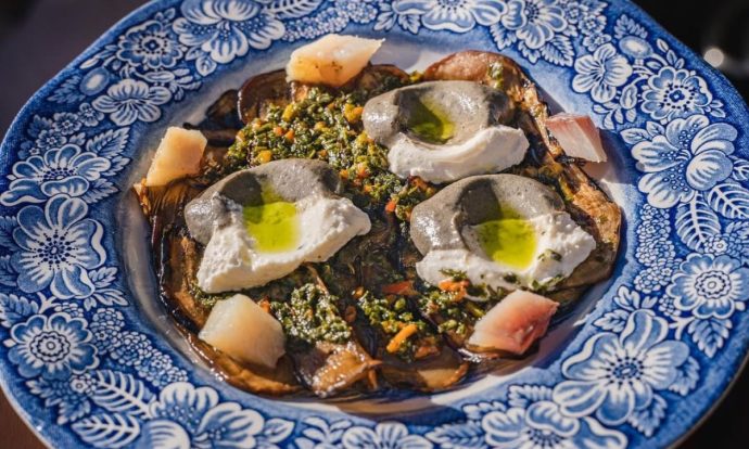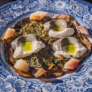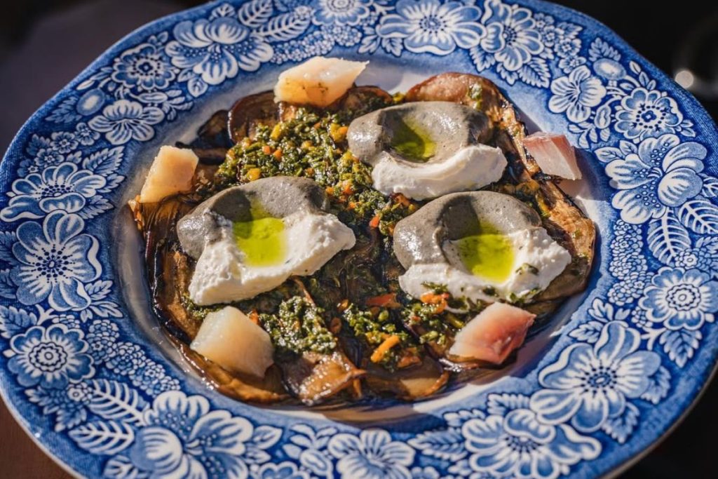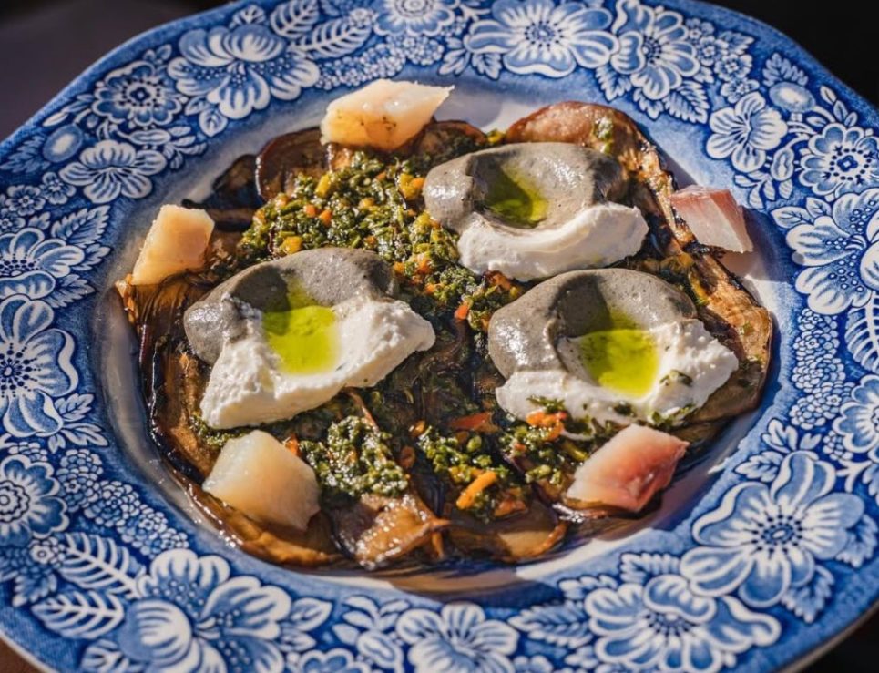 Berenjenas asadas, acompañadas de jurel ahumado, jocoque y mojo de hojas. Foto de Instagram Villa Torél.
