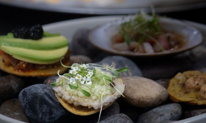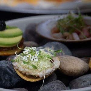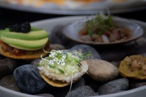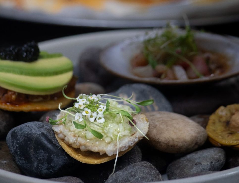 Tostada de mantarraya y oblea de pepita de calabaza del chef Evia + tostada de atún y almeja chocolata del chef Salgado, foto proporcionada por el hotel