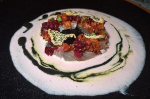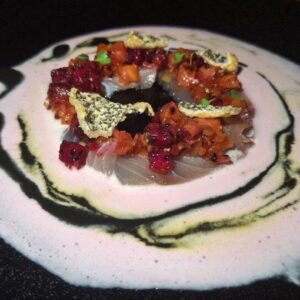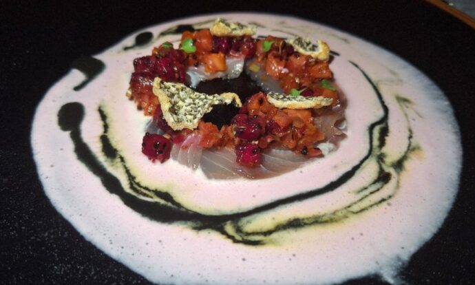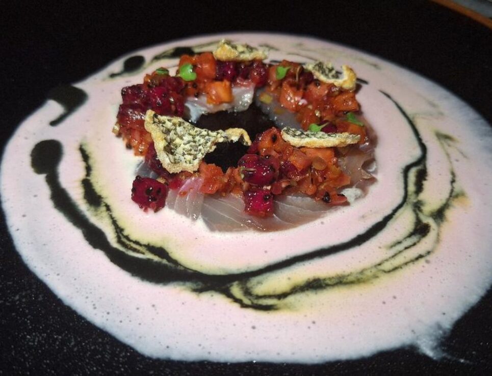 Crudo de pesca, leche de tigre de pitahaya y recado negro del chef Irving Cupul (Ramona – Nizuc Resort & Spa), foto de Miriam Carmo
