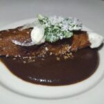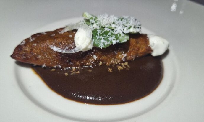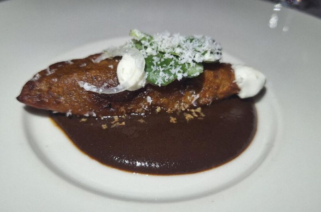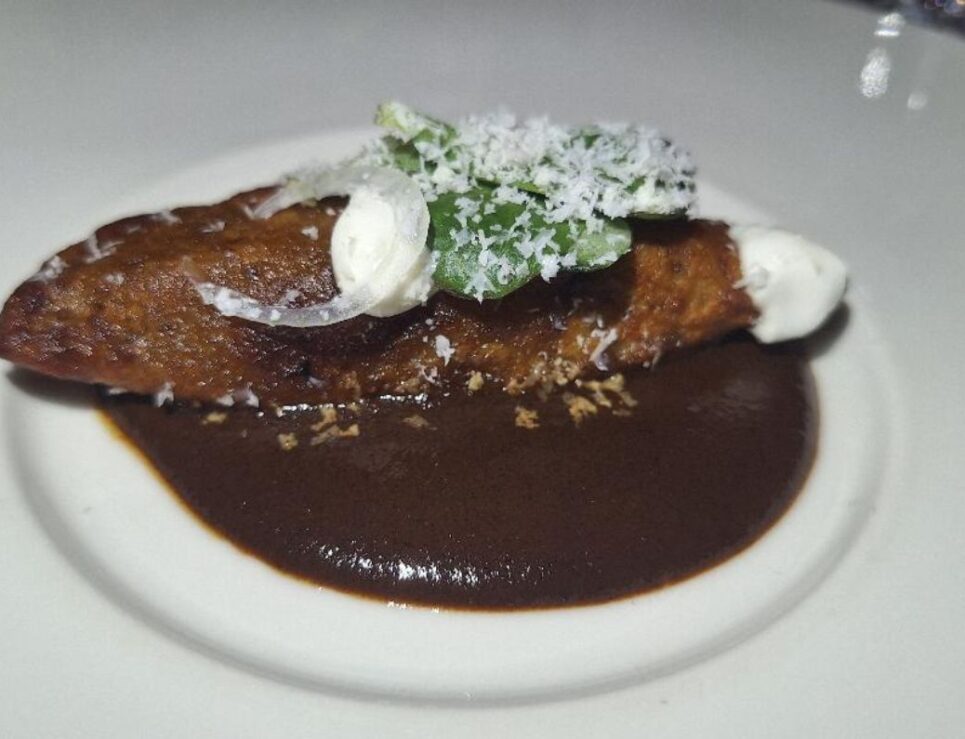 Empanada de plátano macho rellena de lechón en espejo de mole negro, foto de Miriam Carmo