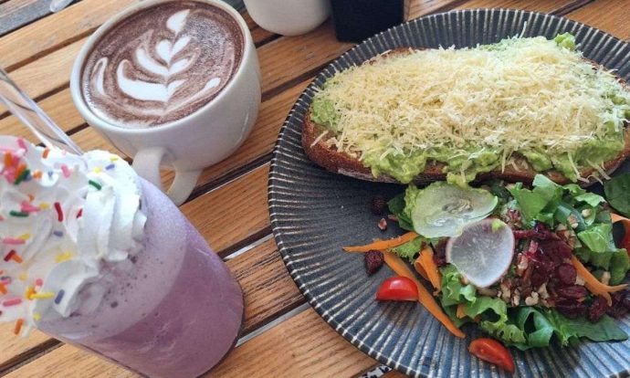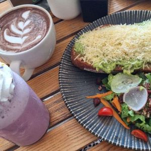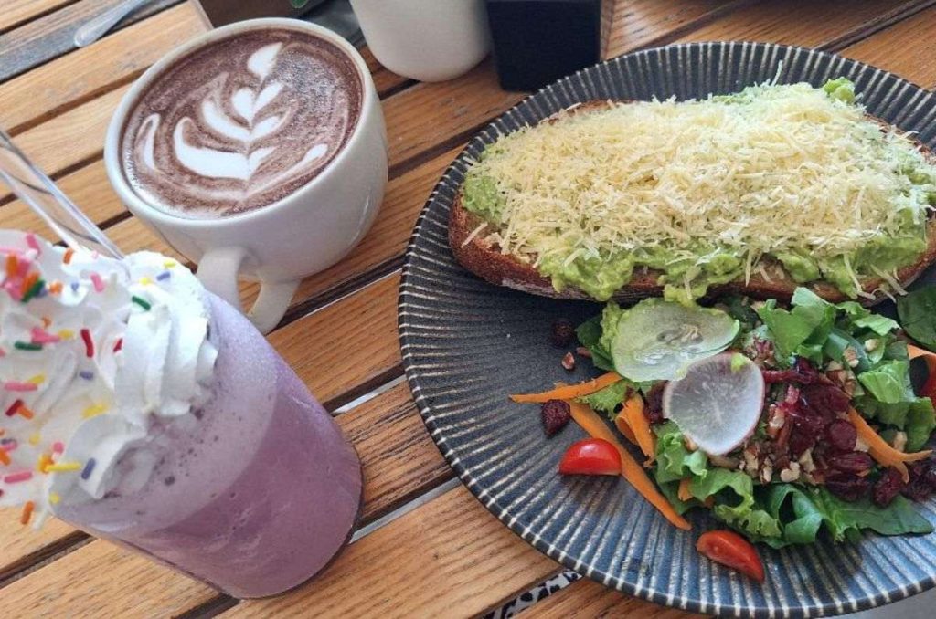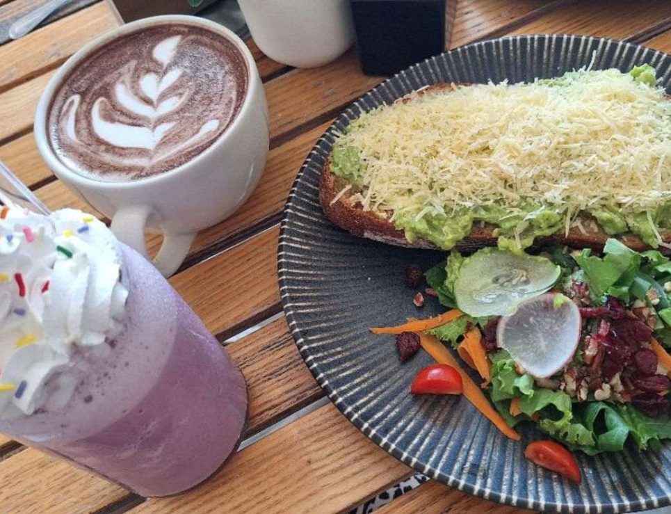 Avocado toast con queso de bola, frappé de taro y chocolate caliente, foto de Miriam Carmo